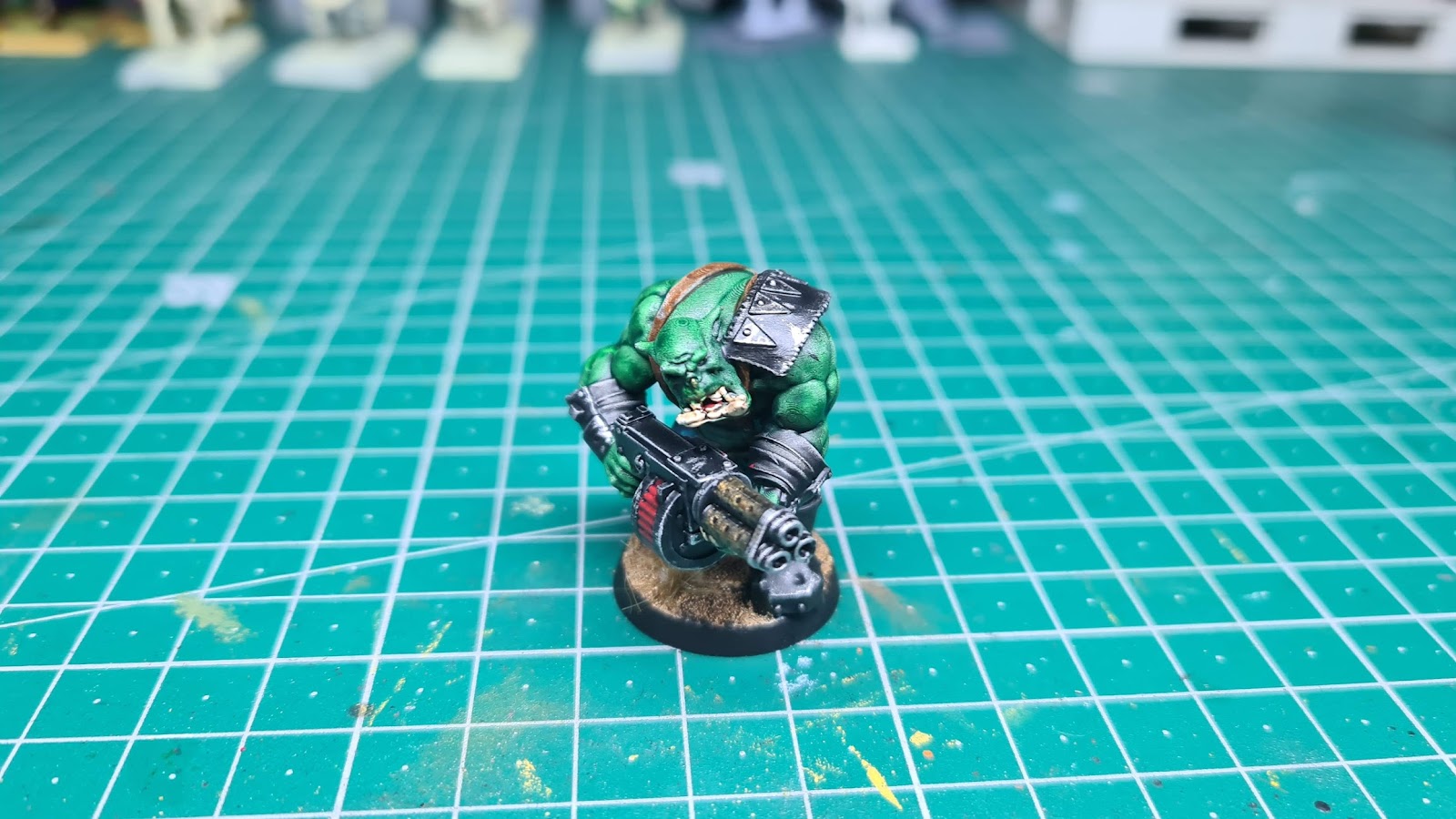 The third ork of the bunch is slightly misprinted, his mouth section jutting out weirdly. I decided not to scrap him, thinking that he could simply be gobsmacked, literally having his jaw smashed and healing incorrectly. This guy is obviously learnt his lesson and now keeps his distance and shoots his weapon, making sure he never runs our of ammo with his large capacity magazine.