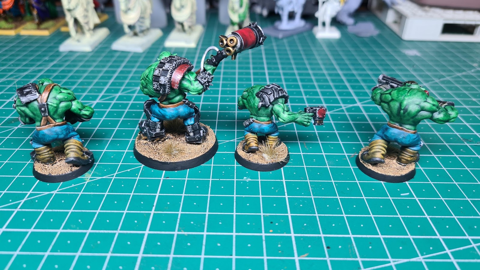 In todays update I have four Orks painted up slap-chop style, all done in one day. These orks are 3D prints I've had for a while, and decided to get them printed out, and managed to finish them in one day. I printed these four, along with a larger Warboss model, which I don't have a big enough base to put him on, and a sixth ork model, but that one failed to print correctly and as such a tossed it away.