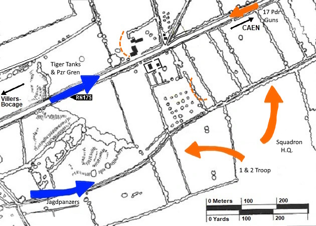 It's not completely clear as to the full detail of the exchange between 1 Troop and the Jagdpanzers as Squadron H.Q. couldn't keep track of the battle, trying to call for help from other Troops in the Squadron to move up from the rear, but it's believed a number of Tanks had been knocked out. Eventually 3 Troop under Lance-Corporal O'Toole found their way forwards and moved in to help out, taking over from 1 Troop who were now called back towards Squadron H.Q. to help out with the growing pressures from Wittmann's Tigers now rolling down the RN175 and from the Panzer-Grenadiers that threatened them. Daringly, Major. Bartlett moved himself and his adjutant forwards, exposing themselves in order to put fire down on the enemy Soldiers in their vicinity. Together with 1 Troop, they soon put an end to that threat, sweeping their positions with their machine-guns. Meanwhile, Lieutenant. Lindstrem of 2 Platoon continued to put fire down on the remaining AA-Halftracks, destroying the remaining trucks there.